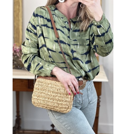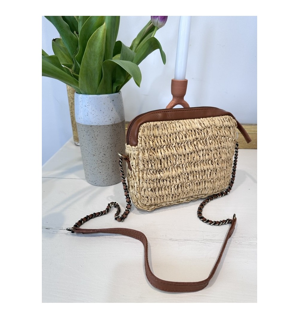 Sac en papier raphia, empiècement cuir, bandoulière chainette et cuir. Porté épaule ou travers.
