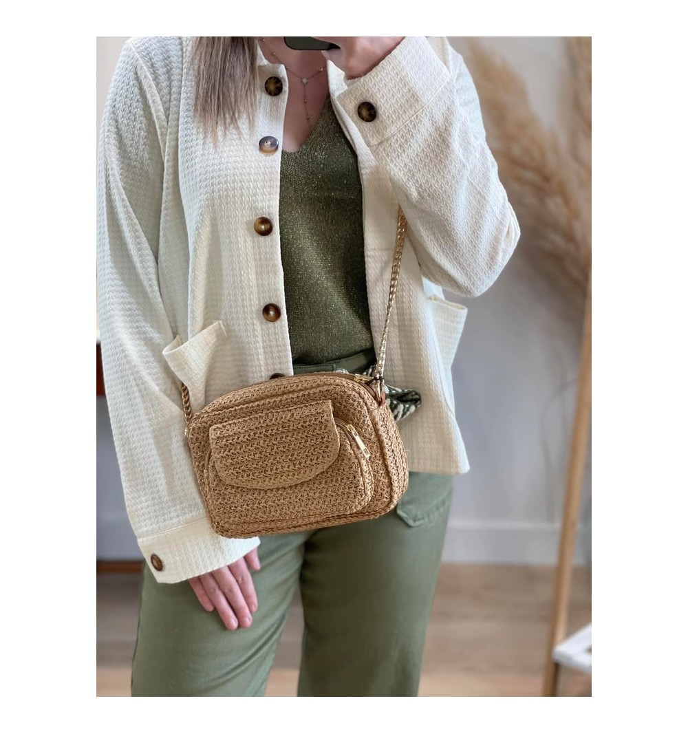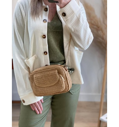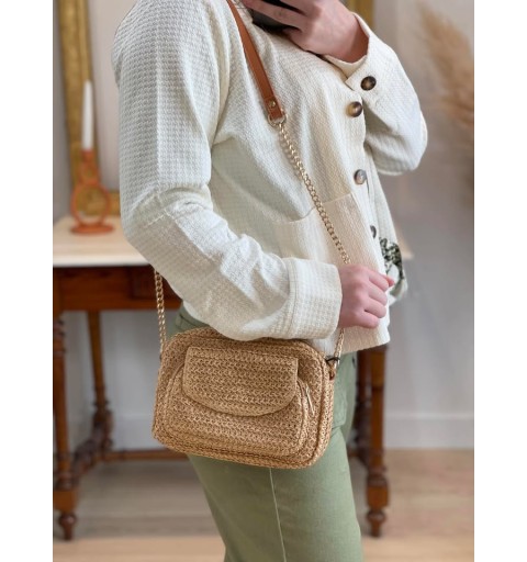 Sac en papier raphia, bandoulière chainette et cuir. Fermeture zip sur les deux poches.
