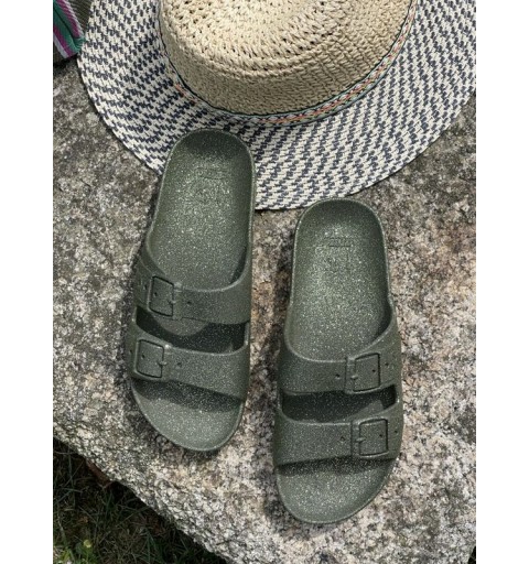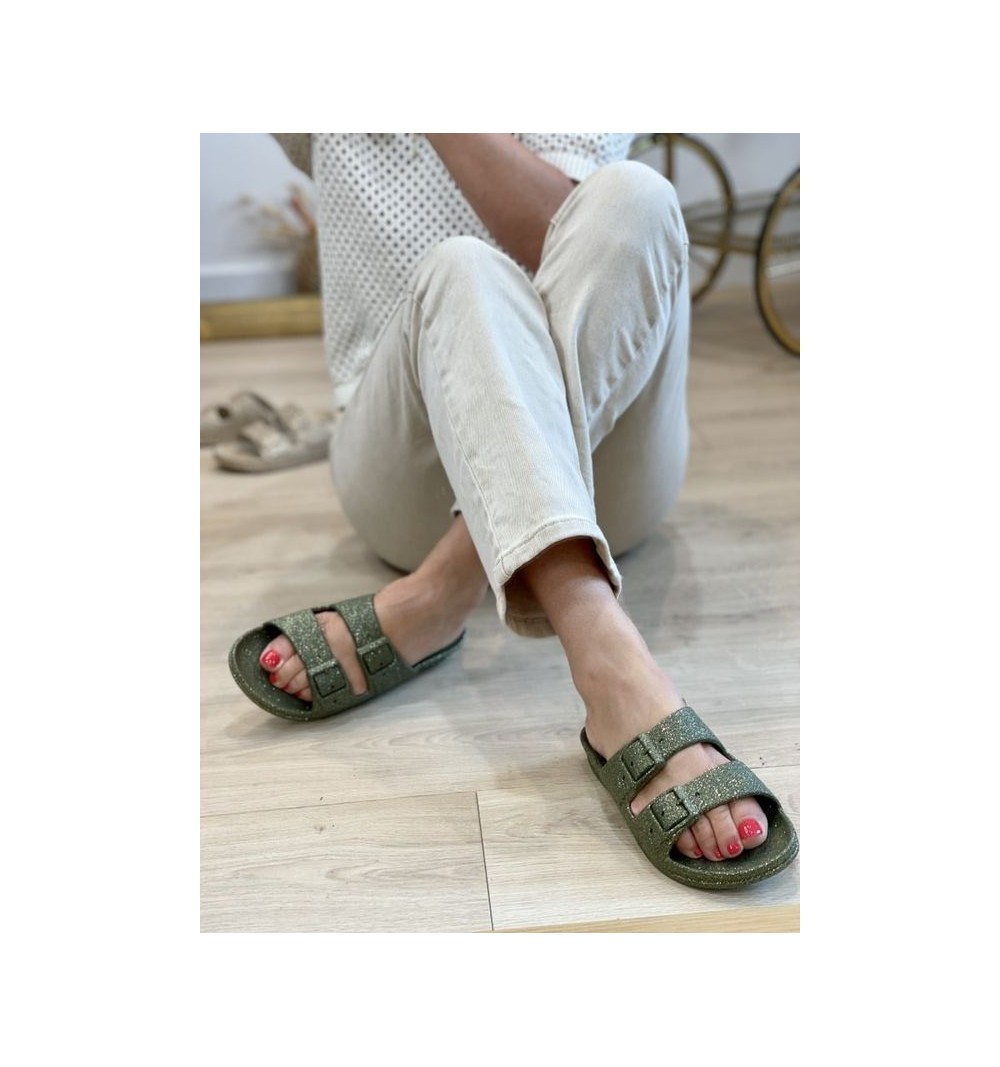 Les boucles sont factices. La totalité des claquettes sont glitter.