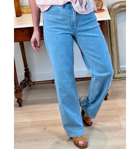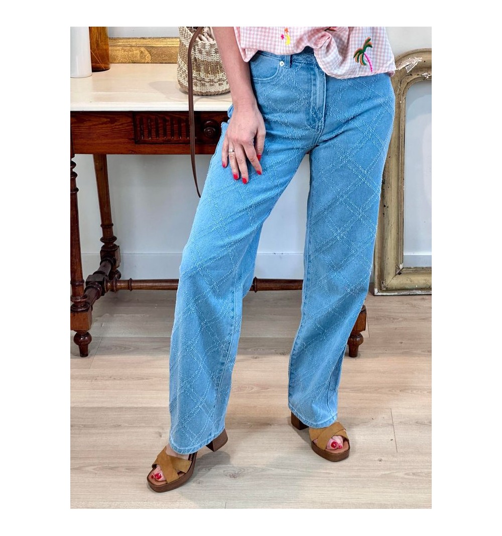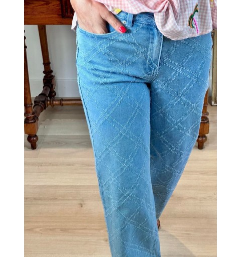 Un denim à l'esprit très couture avec son damier gratté en relief. Taille haute, forme droite.