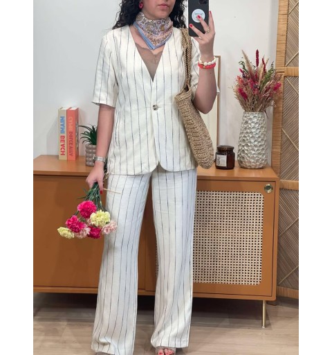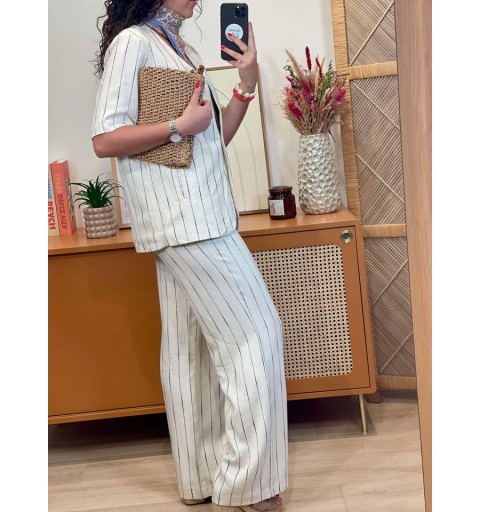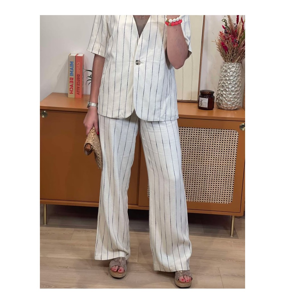 Le pantalon DANCINA au coloris crème et fines rayures bleues offre une silhouette fluide et un style résolument élégant.
