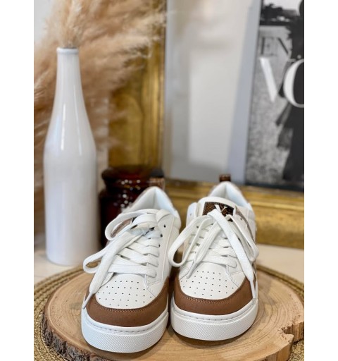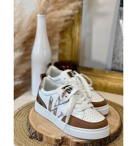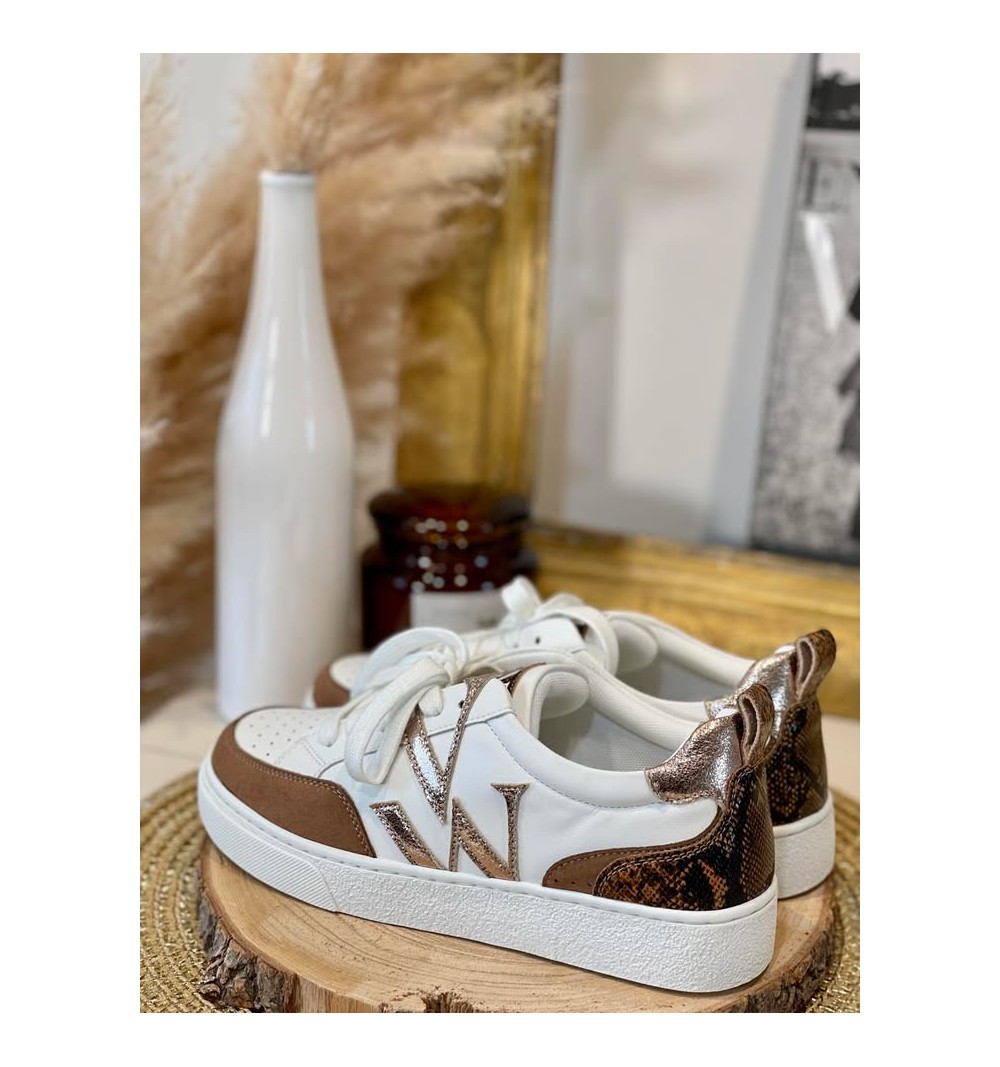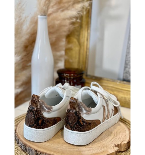 La baskets "joyce" en similicuir imprimé serpent camel et doré.